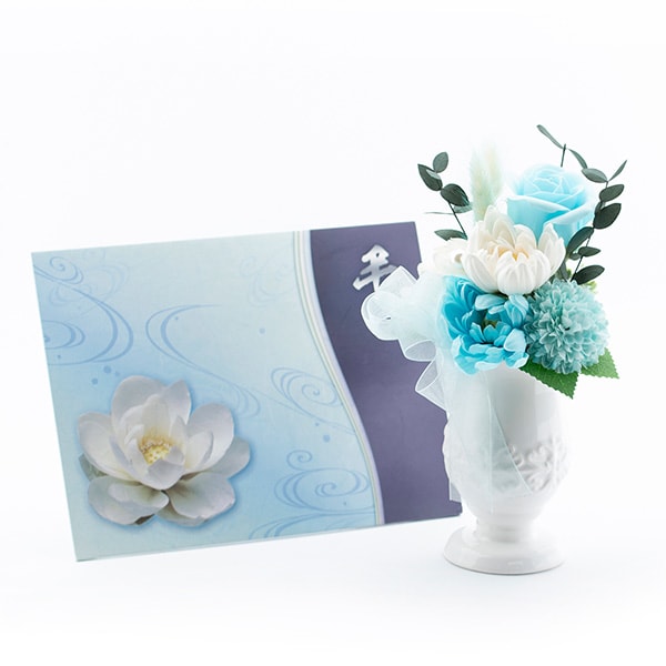 • お悔やみ電報 追悼 ソープフラワー供花アレンジ(ライトブルー)