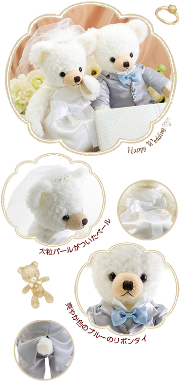 くまのマックとうさぎのラッキー ウェディングぬいぐるみ電報 在庫なし料金:9,680円 こちらはくまのペアではありませんが、くまのマックとうさぎのラッキーのウェディングぬいぐるみです。丁寧に作られた高品質の日本製。素朴などこか懐かしさを感じるぬいぐるみなので、長く可愛がってもらえることでしょう。 詳細を見る