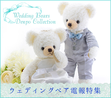 くまのがっこう ジャッキー&デイビッド ウェディングぬいぐるみ電報 料金:16,720円 絵本「くまのがっこう」の中のウェディングシーンがそのまま再現されたぬいぐるみと、まさのそのシーンをデザインしたメッセージカードがセットになったロマンティックな電報です! 詳細を見る